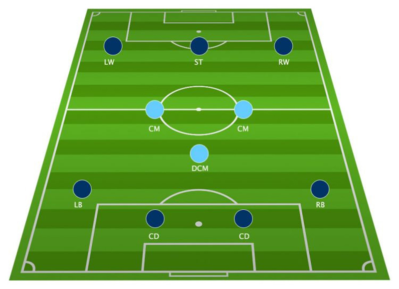 2 trung vệ, 1 tiền vệ phòng ngự lùi ngang cặp full back, giúp cho Lữ đoàn đỏ tạo được ba tam giác chuyền bóng, có thể giúp họ vượt qua được lớp phòng thủ đầu tiên của đội bóng áo xanh.