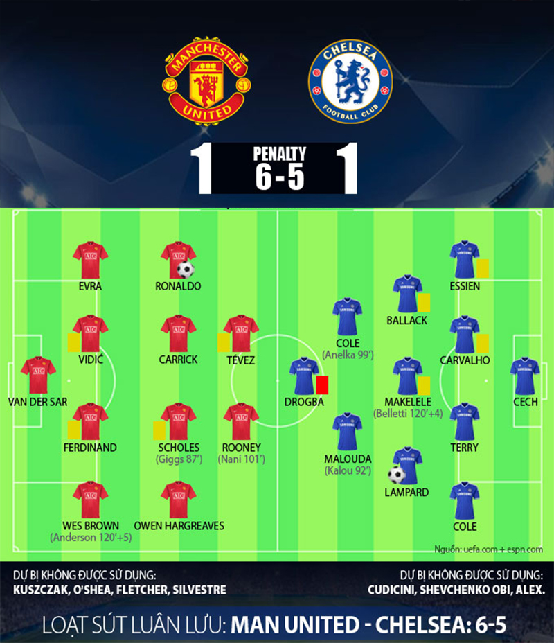 Anderson rồi Giggs sau đó lần lượt thành công trên chấm 11m của mình, còn bên phía The Blues chỉ mình Kalou làm được điều tương tự. Trong khi Anelka không thắng được sự xuất sắc của Edwin Van der Sar.