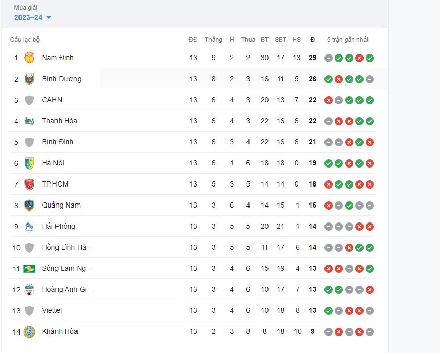 Một bất ngờ khác là Becamex Bình Dương, đội bóng vốn chỉ trụ hạng ở vòng cuối cùng năm ngoái lại leo lên xếp thứ hai với chỉ 3 điểm kém hơn Nam Định cùng thành tích đối đầu tốt nhất trong nội bộ nhóm 5 đội dẫn đàu.