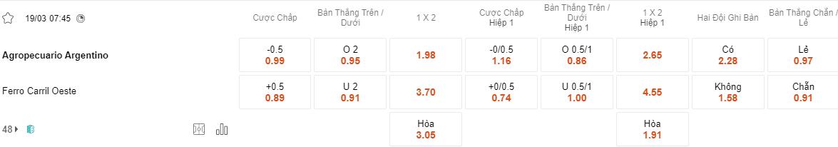 Tỷ lệ kèo Agropecuario vs Ferro Carril Oeste
