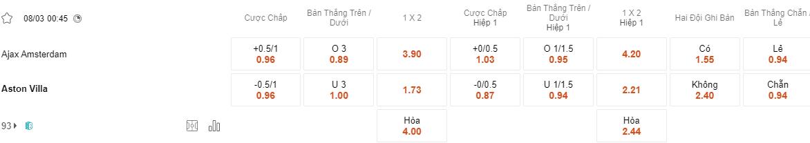 Soi kèo Ajax vs Aston Villa lúc 0h45 ngày 8/3/2024