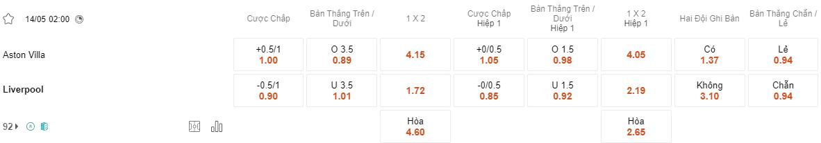 Soi kèo Aston Villa vs Liverpool lúc 2h00 ngày 14/5/2024