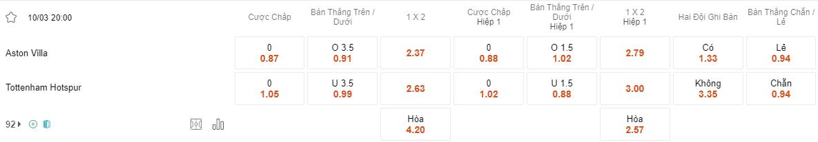 Tottenham thường xuyên gặp khó khăn khi phải thi đấu trên sân khách và đã không thắng trong 3 trận gần nhất trên mặt cỏ lạ. Dựa vào sự ổn định của Aston Villa cả ở mặt tấn công và phòng ngự, cùng với lợi thế sân nhà, đội bóng này được dự đoán sẽ giành chiến thắng kèo trong trận đấu này. Aston Villa cũng đã toàn thắng trong 3 lần đụng độ gần nhất.