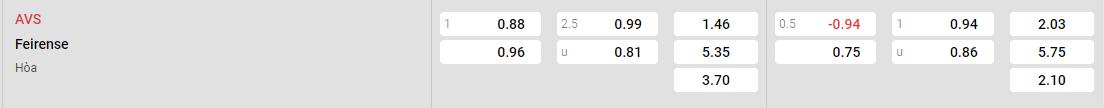 Với phong độ thi đấu ổn định, AVS thường nhập cuộc trận đấu chủ động. Khi mà 3/4 lần ra quân gần nhất, họ đã ghi bàn trong hiệp 1. Bên kia chiến tuyến, Feirense lại chơi phòng ngự không tốt trong 45 phút đầu tiên. Với việc 3/5 trận gần nhất, họ phải nhận bàn thua. Do đó, khả năng cao AVS sẽ là lựa chọn sáng nước hơn tại kèo hiệp 1 trận này.