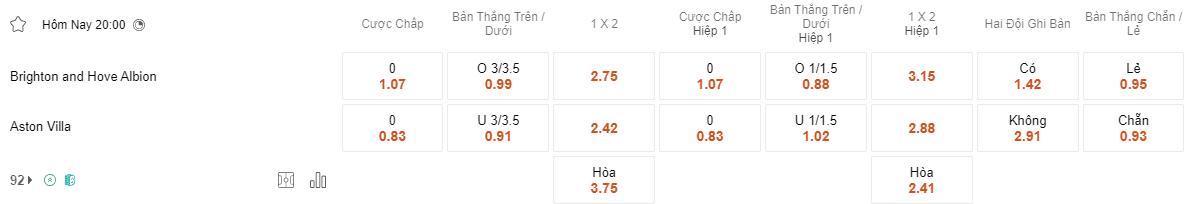 Ngoài ra, Aston Villa cũng đã có chiến thắng đậm đà 6-1 trước Brighton ở trận đấu trước đó mùa này. Đây cũng là chiến thắng thứ 2 liên tiếp của họ trước đối thủ này. Với tất cả những yếu tố trên, việc đặt niềm tin vào Aston Villa là một lựa chọn hợp lý trong trận đấu này.