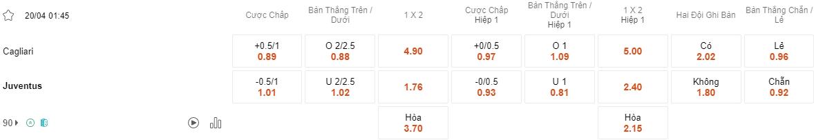 Trong các trận gần đây, Juventus đã thường xuyên dẫn trước ở hiệp 1 và giành chiến thắng hoặc duy trì cách biệt đến khi hiệp 1 kết thúc. Đặc biệt khi họ đối đầu với các đối thủ không mạnh như Cagliari. Mặt khác, Cagliari thường khá chậm chạp trong việc bắt đầu trận đấu và thường phải tốn khá nhiều thời gian để có thể nhập cuộc. Cửa cược của họ đã khiến bet thủ ôm hận trong 3/4 lần mở kèo hiệp 1 gần đây. Điều này có thể tạo điều kiện thuận lợi cho Juventus để tận dụng và kiểm soát trận đấu từ đầu.
