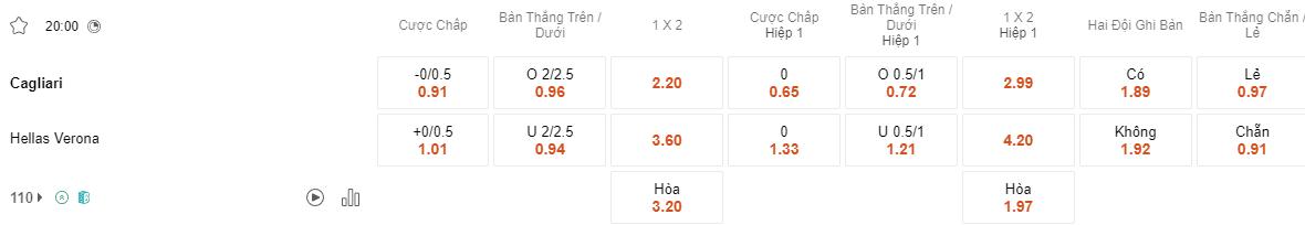 Trong khi đó, Verona sẽ nhập cuộc với tinh thần lạc quan, dựa vào thành tích đối đầu tốt của họ với Cagliari. Họ đã thắng 2 trận gần đây trước đối thủ này và đã có ưu thế trước đối thủ này trong quá khứ. Bên cạnh đó, họ cũng đã giành chiến thắng kèo trong 3/4 lần hành quân gần đây.