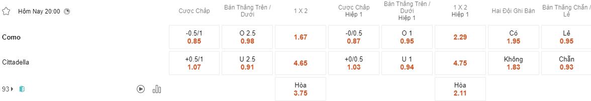 Como đã thể hiện sự mạnh mẽ khi chơi tại sân nhà khi giành chiến thắng trong 7 trận trong tổng số 10 trận gần nhất. Trong số đó, Como thường có bàn thắng sớm và tạo ra áp lực ngay từ những phút đầu tiên của trận đấu. Cửa cược của họ đã giúp bet thủ vượt ải thành công trong 3 lần mở kèo hiệp 1 trên sân nhà gần đây. Trong khi đó, Cittadella gần đây đã gặp khó khăn trong việc duy trì phong độ và thường thiếu hiệu suất tấn công trong hiệp 1 của các trận đấu.