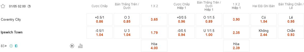 Ipswich thường có màn trình diễn mạnh mẽ từ đầu trận, và các số liệu thống kê cũng cho thấy điều này. Trong 3 lần hành quân gần đây của Ipswich, họ đã dẫn trước tại hiệp 1 trong 2 trận. Ngược lại, Coventry thường bước vào hiệp 1 một cách khá bị động. Họ đã bị dẫn bàn ở hiệp trong 4 trong số 5 trận gần đây. Với sự ổn định và khả năng tấn công mạnh mẽ, Ipswich có thể tỏ ra nổi trội ở hiệp 1 của trận đấu và làm nên sự khác biệt từ phút đầu tiên.