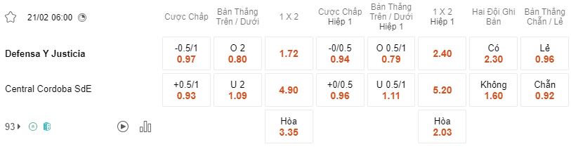 Tỷ lệ kèo Defensa Justicia vs Central Cordoba
