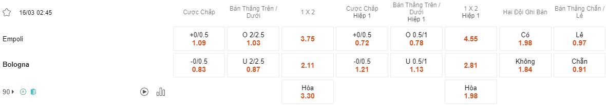 Dù đã gặp phải một số khó khăn trên sân khách ở mùa giải này, Bologna đã thể hiện sự cải thiện rõ rệt trong những trận đấu gần đây. Với tham vọng giành điểm đầy quan trọng trước một đối thủ đang gặp khó khăn như Empoli, Bologna được dự đoán sẽ thi đấu quyết tâm và tự tin. Tỷ lệ thắng kèo ở cửa cược của họ đang là 80% trong 10 lần mở kèo gần nhất.