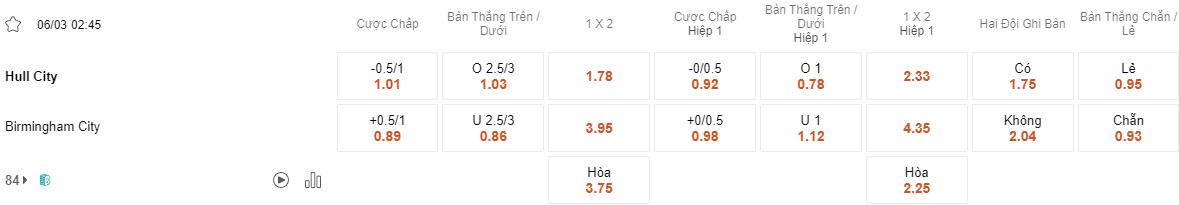 Tỷ lệ kèo Hull vs Birmingham