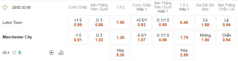 Dù Manchester City là ứng viên mạnh mẽ, nhưng Luton có thể sẽ tạo ra sự bất ngờ trong trận đấu này. Sự ủng hộ từ khán giả nhà cùng với tinh thần thi đấu cao của Luton có thể là yếu tố quyết định giúp họ giành chiến thắng kèo. Đặc biệt là khi, những cuộc đụng độ gần nhất giữa hai đội đều có cách biệt không quá lớn.