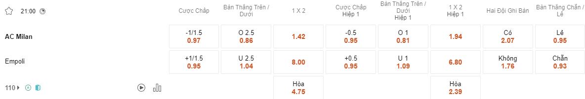 Khi đá trên sân nhà San Siro, Milan thường có lợi thế và khả năng tạo ra nhiều cơ hội nguy hiểm từ những phút đầu của trận đấu. Trong khi đó, Empoli có thể gặp nhiều khó khăn trong việc duy trì sự cân bằng trước sức ép từ đối thủ. Do đó, kèo Milan thắng hiệp 1 có thể là một lựa chọn hợp lý cho trận đấu này. Cửa cược của họ đã giúp bet thủ vượt ải thành công trong 3/4 lần đón khách gần nhất.