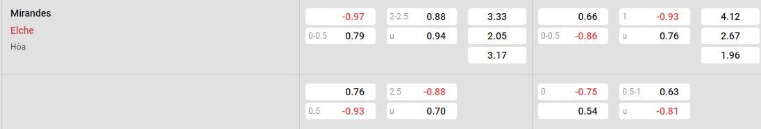 Cũng theo thống kê cho thấy, có 4/5 trận gần nhất, Mirandes đã không ghi được bàn trong hiệp 1. Tuy nhiên, Elche lại đang chơi phòng ngự không tốt. Với việc có 3/4 trận gần nhất, họ để thủng lưới trong 45 phút đầu tiên. Do đó, nhiều khả năng Mirandes sẽ có được điều mình cần trong hiệp 1 trận này.