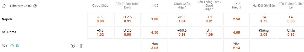 Trong 5 trận gần đây của Napoli, họ đã thua kèo hiệp 1 tới 4 trận và chỉ thắng 1 trận. Trong khi đó, Roma đã có thành tích ấn tượng hơn với 3 chiến thắng kèo trong 5 trận gần đây của họ ở hiệp 1. Dựa vào các số liệu này, giới chuyên gia tin rằng Roma là một lựa chọn hợp lý cho trận đấu này.