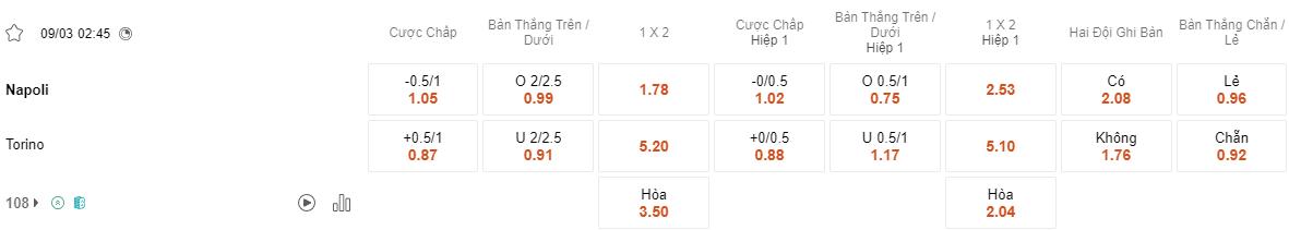 Napoli với lợi thế sân nhà và phong độ ổn định, có thể sẽ nhập cuộc mạnh mẽ và tấn công mạnh từ đầu để tạo ra sức ép lên hàng thủ của Torino. Trong khi đó, Torino, đang gặp khó khăn về phong độ và có thể sẽ phải đối mặt với sự áp đặt từ Napoli. Cược cửa cược của đội chủ nhà đã giúp bet thủ thắng kèo trong 2 trận gần nhất.