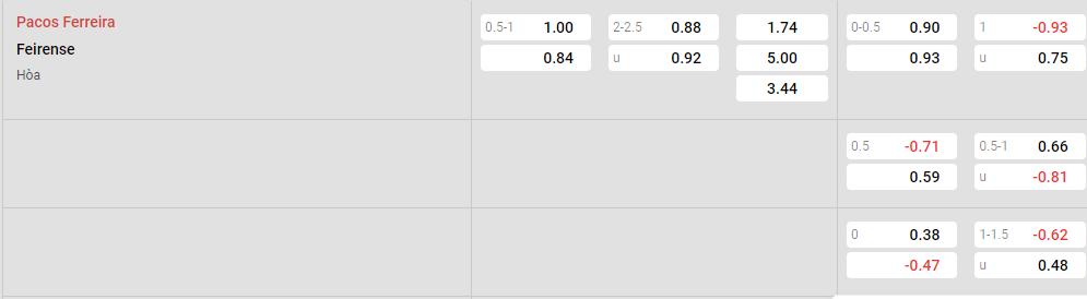 Với 40% tỷ lệ thắng kèo sau 5 trận gần nhất, Pacos Ferreira không phải là cửa đặt mang lại nhiều lợi nhuận. Tuy nhiên, khả năng thắng kèo của Pacos Ferreira vẫn chắc chắn hơn. Khi mà có 3/4 trận mở kèo với đối thủ trên sân nhà, họ đã thắng cược. Do vậy, với việc chấp 0.75 bàn trước Feirense, các chuyên gia đang đánh giá cao Pacos Ferreira sẽ là lựa chọn an toàn hơn.