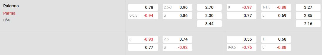 Được cho là có lợi thế hơn đối thủ khi Palermo được chơi trên sân nhà. Tuy nhiên, với phong độ hiện tại và vị trí trên bảng xếp hạng cao hơn đối thủ, Parma vẫn được cho là sẽ nhập cuộc trận đấu tốt hơn. Mặc dù vậy, 4/5 trận gần nhất, Palermo đã không thủng lưới trong 45 phút đẩu. Do vậy, khả năng cao hiệp 1 trận này sẽ chưa thể xuất hiện bàn thắng.