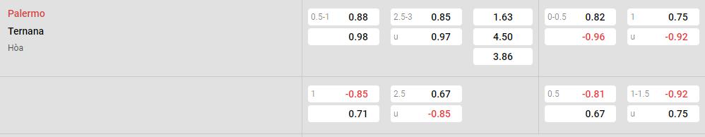 Cũng theo thống kê cho thấy, có 4 trong 6 lần ra quân gần nhất, Palermo đã ghi được bàn trong hiệp 1. Mặc dù, Ternana lại chơi phòng ngự khá tốt trong 45 phút đầu tiên. Với việc sau 5 trận gần nhất, họ đều không phải nhận bàn thua. Tuy nhiên, Palermo vẫn có cơ hội khả quan để thắng kèo hiệp 1 trận đấu này.