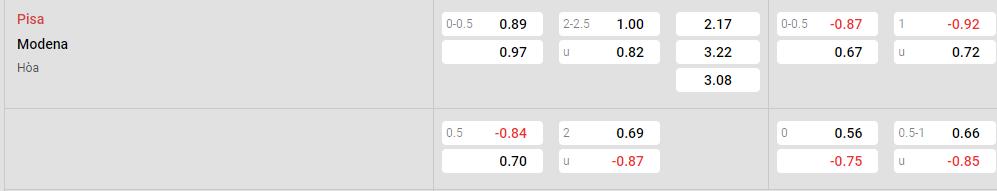 Mặc dù không có phong độ ấn tượng, tuy nhiên, Modena vẫn nhập cuộc khá chủ động. Khi mà có 3/5 lần ra quân gần nhất, họ đã ghi bàn trong hiệp 1. Trong khi Pisa lại chơi phòng ngự khá thất vọng trong 45 phút đầu tiên. Với việc 3/4 trận gần nhất, họ phải nhận bàn thua. Do đó, khả năng cao Modena sẽ là lựa chọn sáng nước hơn tại kèo hiệp 1 trận này.