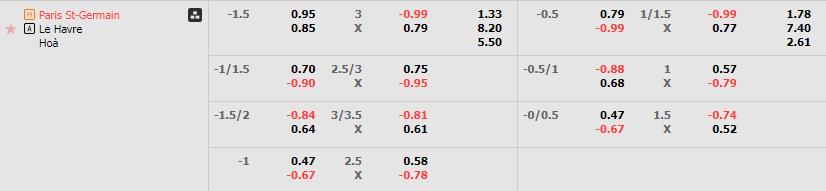 Với phong độ thi đấu ổn định, PSG thường nhập cuộc đầy chủ động. Khi mà có 4/5 lần ra quân gần nhất, họ đã ghi bàn trong hiệp 1. Mặc dù, Le Havre lại chơi phòng ngự không quá tệ trong 45 phút đầu tiên. Với việc sau 3 trận gần nhất, họ không phải nhận bàn thua. Tuy nhiên, khả năng cao PSG vẫn sẽ ghi bàn và thắng kèo hiệp 1 trận này.