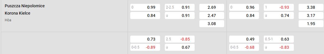 Cũng theo thống kê cho thấy, có 4/5 trận đối đầu gần nhất, Korona đã ghi bàn trong hiệp 1. Mặc dù, Puszcza đang chơi phòng ngự khá chắc chắn. Với việc họ đã không phải nhận bàn thua trong hiệp 1 ở 5 lần ra quân liên tiếp gần nhất. Tuy nhiên, khả năng cao Korona vẫn sẽ là lựa chọn sáng nước hơn tại kèo hiệp 1 trận này.