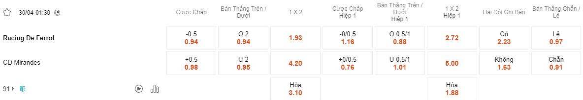 Racing Ferrol đã thể hiện sự mạnh mẽ tại sân nhà khi không thua trong 6 trận gần đây tại địa điểm này. Trong khi đó Mirandés đã gặp khó khăn khi thi đấu trên sân khách khi không giành được chiến thắng trong 12 trận đấu liên tiếp. Cửa cược của họ đã khiến bet thủ ôm hận trong 5/6 lần mở kèo hiệp 1 trên sân khách gần đây.