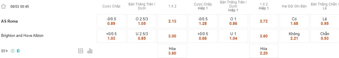 AS Roma đang có phong độ ổn định và được hưởng lợi từ lợi thế sân nhà. Họ sẽ cố gắng tấn công sớm để tạo ra áp lực lên đội khách. Với sự sắc bén trong lối tấn công, Roma có khả năng tạo ra cơ hội và ghi bàn trong hiệp 1. Trong khi đó, Brighton có thể gặp khó khăn trong việc chống lại sức ép từ đội chủ nhà và tìm cách tổ chức phòng ngự hiệu quả. Theo thống kê, họ đã bị đánh phủ đầu ở hiệp 1 trong 2 lần hành quân gần nhất.