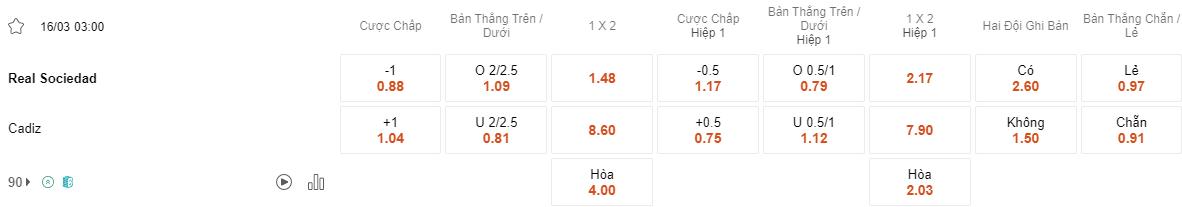 Trong hiệp 1, Cadiz được dự đoán sẽ có khả năng giành chiến thắng kèo. Đội bóng này đã tỏ ra rất tự tin sau chiến thắng đầy bất ngờ trước Atletico Madrid và sẽ tiếp tục cố gắng tận dụng mọi cơ hội để tạo ra sự chênh lệch trên bảng tỉ số. Real Sociedad cũng sẽ không dễ dàng chịu thua trước sự áp đặt của đối thủ. Tuy nhiên, cửa cược của họ đã khiến bet thủ thua kèo hiệp 1 trong 5 trận gần nhất.