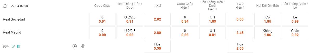 Real Madrid đã thể hiện phong độ ổn định và sự chủ động của mình trong giai đoạn hiệp 1. Đặc biệt là khi họ đang dẫn đầu La Liga với phong độ ấn tượng. Trong 7 trận đã qua, Kền kền trắng đã thành công dẫn bàn ở hiệp 1 tới 5 lần. Sociedad mặc dù là một đối thủ khó chơi, nhưng họ đã có một mùa giải thiếu ổn định và gặp khó khăn trong hiệp đầu của các trận đấu. Cửa cược của họ đã khiến bet thủ ôm hận trong 6/7 lần mở kèo hiệp 1 trên sân nhà gần đây.