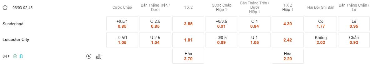 Tỷ lệ kèo Sunderland vs Leicester