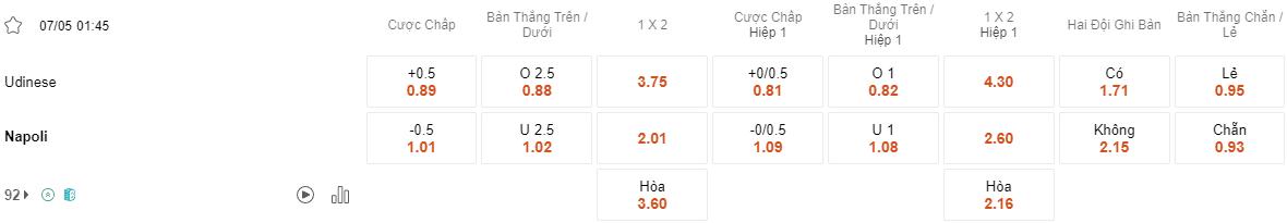 Soi kèo Udinese vs Napoli lúc 1h45 ngày 7/5/2024