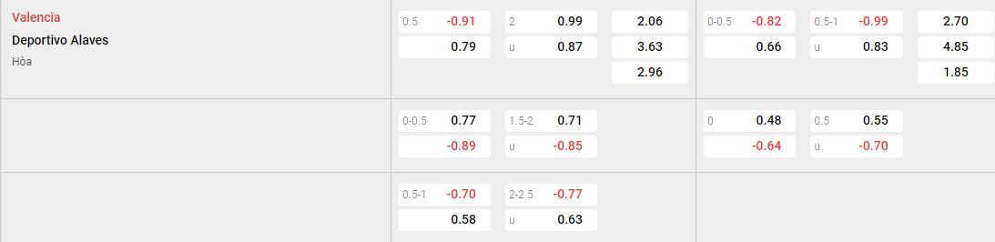 Với phong độ khá ổn định trước đó, Alaves thường nhập cuộc có phần chủ động. Khi mà có 2/3 trận gần nhất, họ đã ghi bàn trong hiệp 1. Trong khi đó, Valencia lại đang không chơi phòng ngự tốt gần đây. Với việc họ đã nhận bàn thua trong hiệp 1 ở 2 lần ra quân gần nhất. Do đó, cơ hội thắng kèo hiệp 1 trận này của Alaves là khả quan hơn.