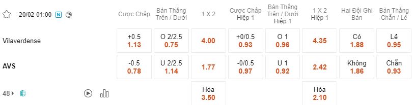 Tỷ lệ kèo Vilaverdense vs AVS