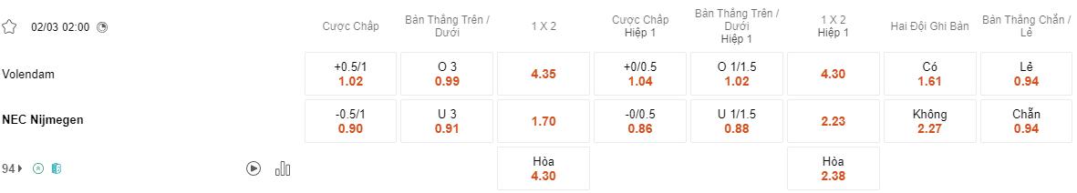 Trận đấu giữa Volendam và NEC trong khuôn khổ vòng 24 của Giải VĐQG Hà Lan có thể sẽ là một trận cầu không quá sôi động. Volendam đang gặp khó khăn trong việc ghi bàn. Trong khi NEC thường chơi với lối đá chắc chắn và hiệu quả. Thêm vào đó, với tình hình cần giành điểm của cả hai đội, khả năng trận đấu diễn ra chặt chẽ và ít bàn thắng được dự đoán. Do đó, việc chọn Xỉu có thể là một lựa chọn hợp lý cho trận đấu này. Qúy vị hãy cùng theo dõi thêm những nhận định kèo mới nhất tại BONGDAINFO.