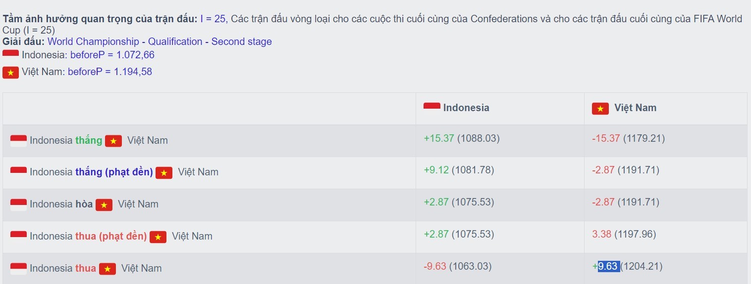 Hiện giới chuyên môn vẫn đánh giá thực lực ĐT Indonesia kém hơn Việt Nam, đặc biệt khi nhiều trụ cột của các chiến binh áo đỏ sao vàng chuẩn bị trở lại sau chấn thương như Tiến Linh, Hoàng Đức, Quế Ngọc Hải, Văn Lâm… Theo tính toán của trang Football Ranking, ĐT Việt Nam sẽ được cộng 9,63 điểm cho trận thắng Indonesia ở lượt đi và có thể nhận tổng cộng 19,26 điểm nếu giành chiến thắng trong trận đấu lượt về.