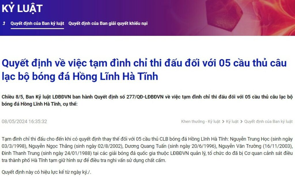 Ngày 8/5, LĐBĐVN nhận được báo cáo từ CLB Hồng Lĩnh Hà Tĩnh về việc tạm đình chỉ thi đấu đối với 5 cầu thủ: Nguyễn Trung Học, Nguyễn Ngọc Thắng, Dương Quang Tuấn, Nguyễn Văn Trường và Đinh Thanh Trung do vi phạm nội quy, quy định sinh hoạt và điều lệ tổ chức hoạt động của CLB.